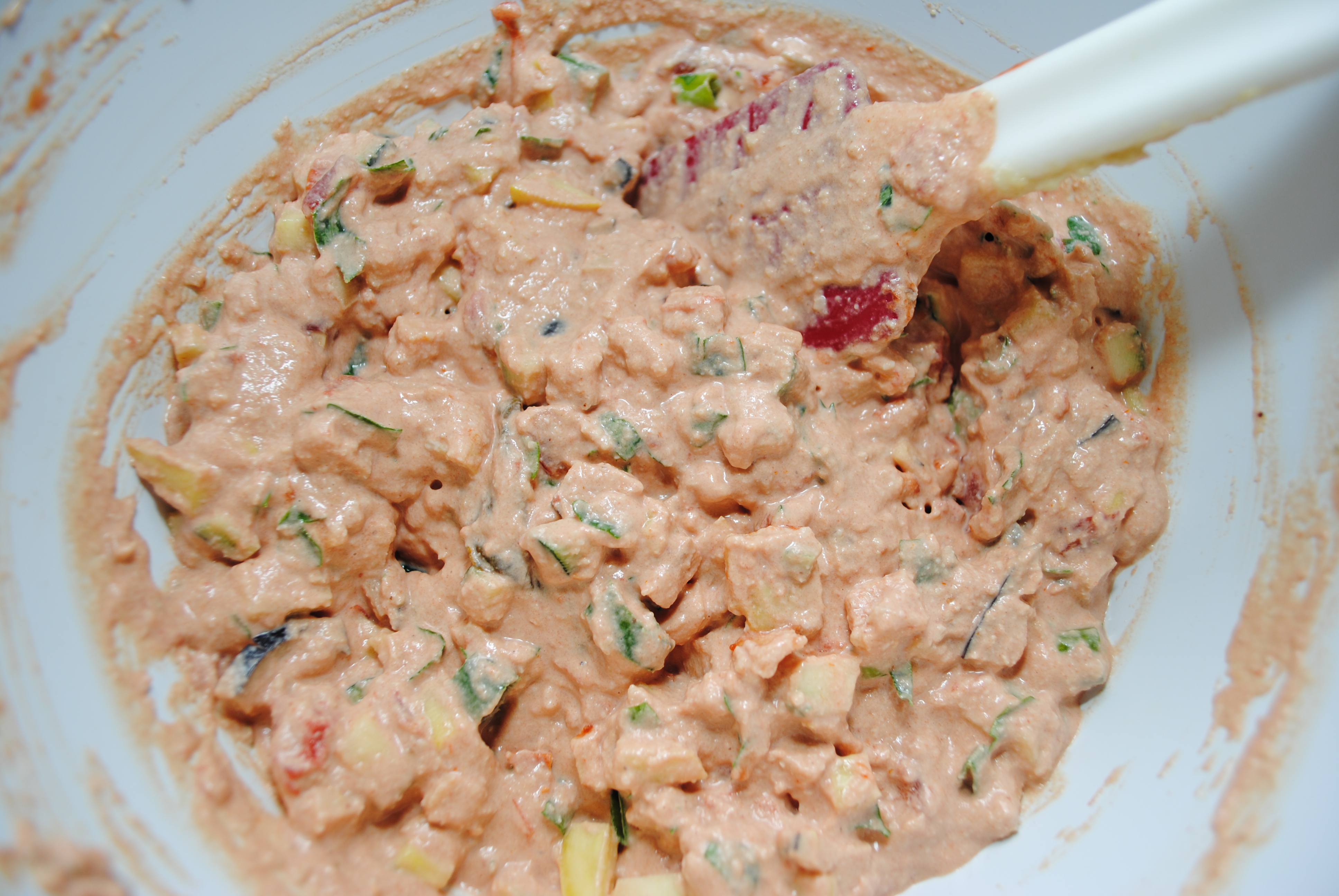 Next, add diced eggplant, zucchini, squash and tomatoes to cashew ricotta to make lasagna filling.  It should look like this…